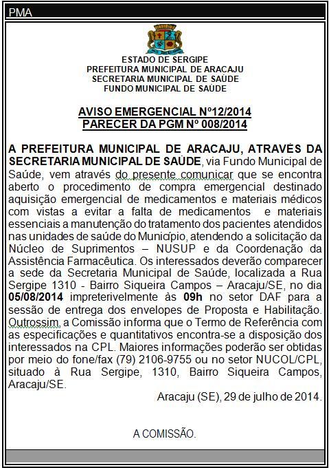 A Secretaria de Saúde de Aracaju lança edital para aquisição emergencial de medicamentos e materiais médicos, para abastecimento das unidades de saúde da capital.
