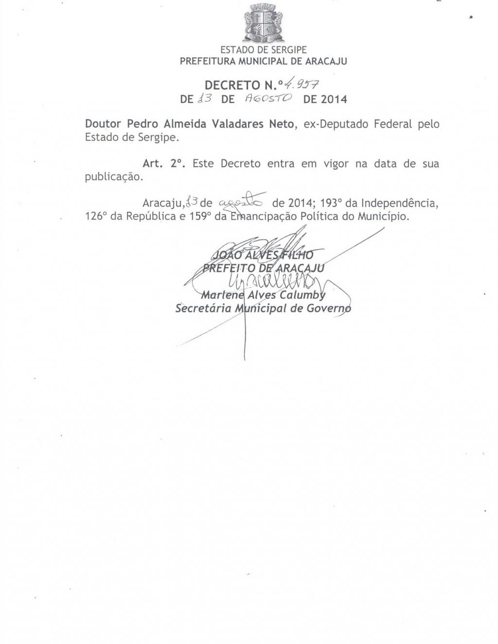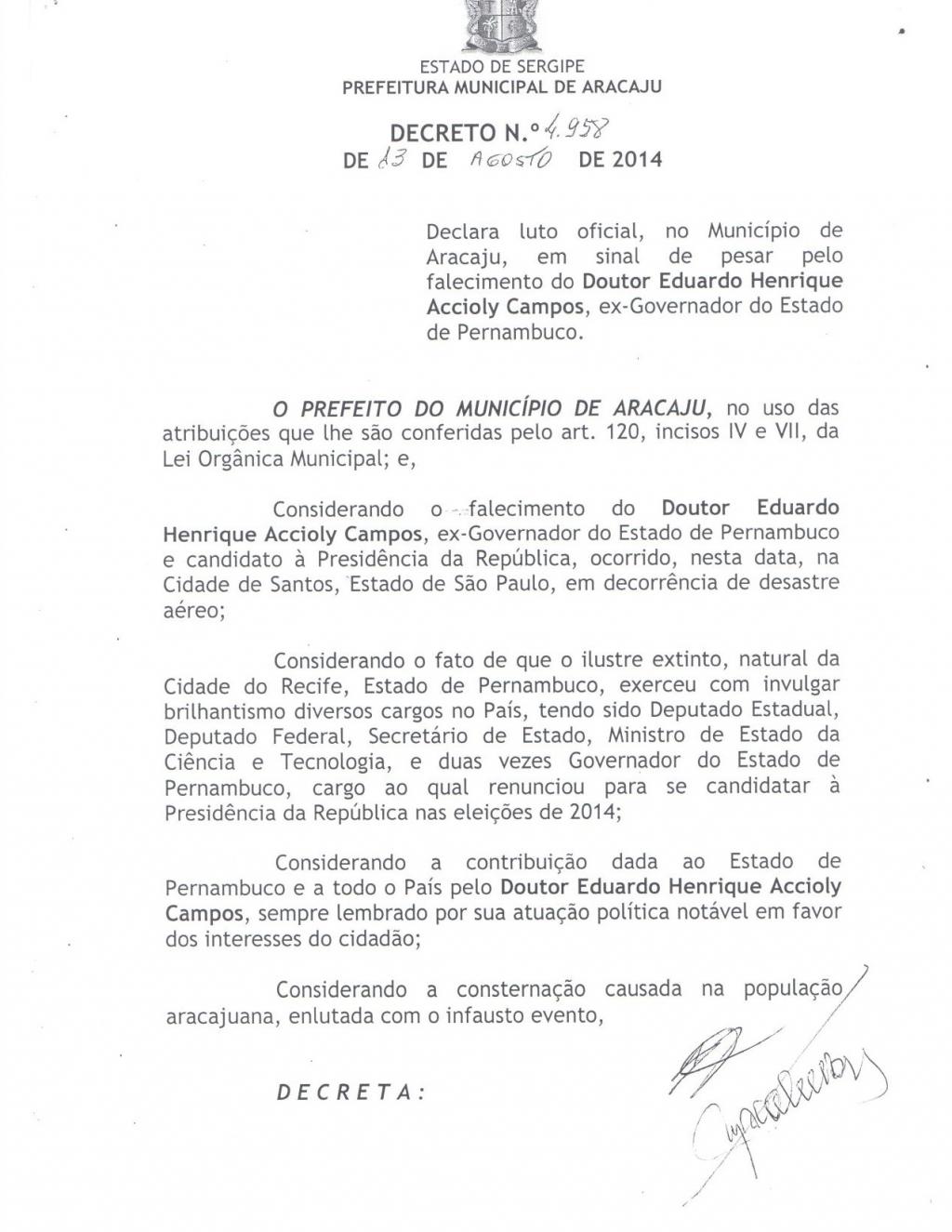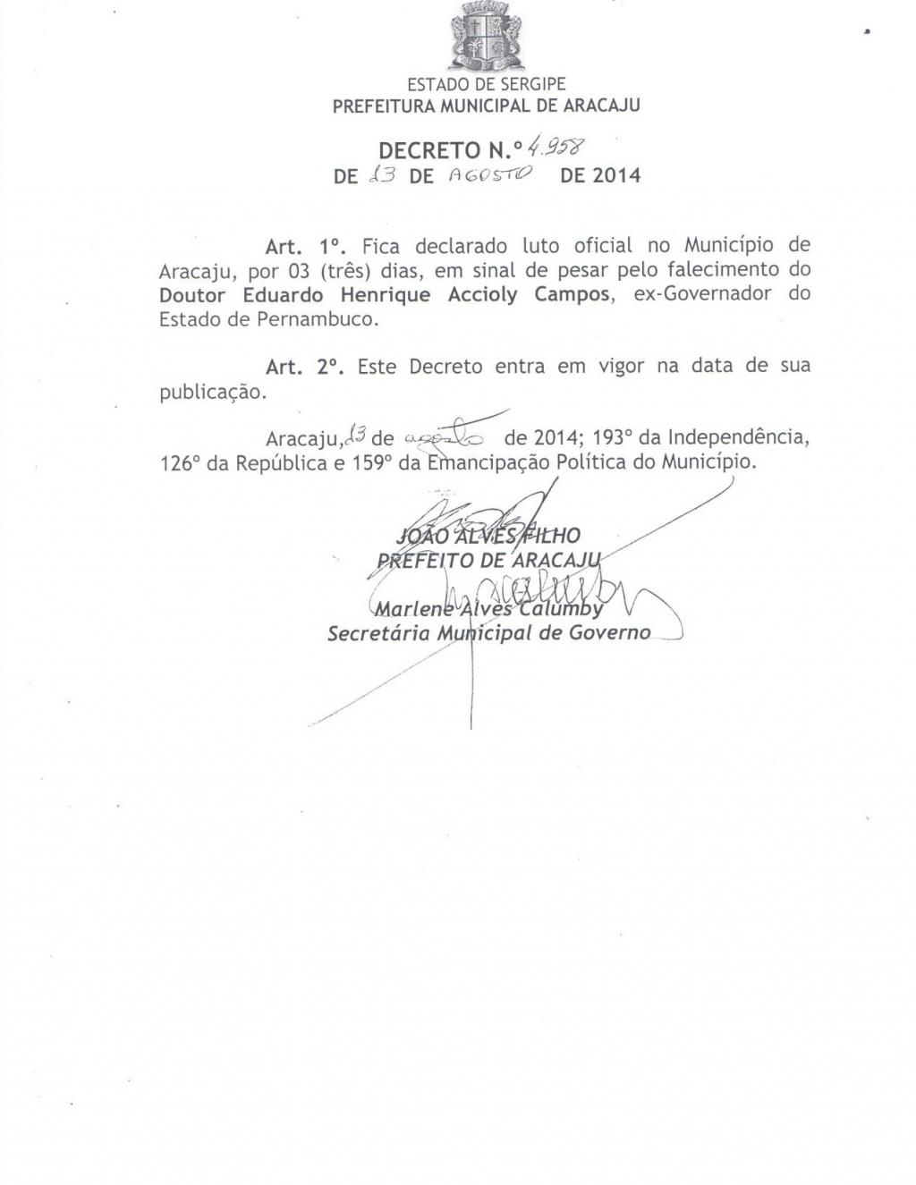 O prefeito João Alves Filho decreta luto oficial por três dias em Aracaju, pelos falecimentos de Eduardo Campos, Pedro Valadares Neto e pelo Cantor Rogério.