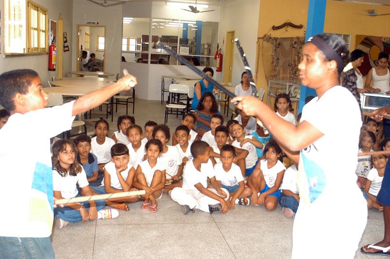A Biblioteca Municipal Ivone de Menezes, no conjunto Augusto Franco, transformou o seu ambiente em um espaço de manifestação folclórica, em comemoração a Semana do Folclore. Alunos da Escola Municipal de Ensino Fundamental Jaime Araújo fizeram uma apresentação na manhã de hoje, 24, do maculelê e da capoeira, para crianças da Escola Francisco Portugal, freqüentadores assíduos da unidade. A apresentação folclórica faz parte da programação que a Biblioteca Ivone de Menezes organizou para o mês do folclore. Até o dia 31, alunos das escolas da comunidade estão sendo convidados para ouvir lendas e mitos do folclore brasileiro. As histórias são contadas pela professora responsável pelo setor infanto-juvenil da Biblioteca, Lucivanda Mendonça. Existe uma curiosidade muito grande por parte das crianças. Hoje comentamos as lendas mais conhecidas e exploramos duas novas, Muiraquitã e A cobra grande, comenta. Para Lucivanda, é importante se passar adiante a cultura popular através das lendas que despertam o imaginário das crianças. As lendas são misturas de personagens do folclore. Tem um monte de lendas atrás que eu não sabia, disse Robert David, 8 anos. Ele ainda comenta a possibilidade de aprender lições das histórias contadas, entre elas Pinóquio.