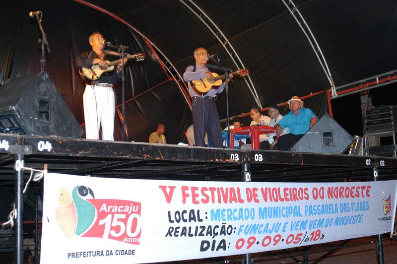 Um pouco da autêntica cultura nordestina foi demonstrada na última sexta-feira durante o V Festival de Violeiros, realizado pela Fundação Municipal de Cultura, Turismo e Esportes (Funcaju). O festival fez parte da programação da I Mostra de Cultura Popular de Aracaju. O público pôde apreciar repentes como A vida de mentiroso; Guardei dentro do cofre do presente as melhores lembranças do passado; O dever do bom cristão; Foi ela a única culpada do fim da nossa união; entre outros, que acalentaram a noite de dezenas de pessoas que compareceram aos mercados municipais. Dez violeiros de todo Nordeste dividiram-se em cinco duplas para apresentar a arte da viola. Vem Vem do Nordeste (SE) e Gilberto Alves (AL), Zé Cardoso (RN) e Fenelon (PB), Leandro (BA) e Galego da Viola (PE) mas há 35 anos radicado em Sergipe, João Bezerra (PB) e Palmeirinha (BA), e João Ramos e Caboclinho, Feira de Santana (BA). Ao final do festival todos ganharam troféus. Mas como é bom saber que ainda continua viva a prosa dos violeiros, disse a dona de casa, Luzinete Lima, 64, que saía de um supermercado próximo ao local do evento e ao perceber a festa resolveu assistir as apresentações. Trouxe a minha família para eles vêem o que é nossa cultura, frisou Carlos Braz, operador industrial. Iniciativas como esta valorizam a nossa cultura e, por certo, levará a outras entidades e empresas sergipanas e aracajuanas a investirem mais na cultura local, comentou o relações públicas, Jorge Luiz. Ele disse ainda que a população admira atividades artísticas deste nível. A prova está aqui com a presença de famílias. Dança Antes da apresentação dos violeiros, meninas da oficina de dança da cidade de Umbaúba, sob o comando da professora Cleanes, apresentaram o trabalho desenvolvido há seis meses. Segundo a professora Genalva da Cruz, idealizadora da oficina, este projeto que contempla 25 alunas de escolas públicas da cidade visa apontar para elas a cultura que está dentro de cada um... "Queremos mostrar para as estas meninas que existe outra música além das que tocam diariamente nas rádios e televisões, diz.