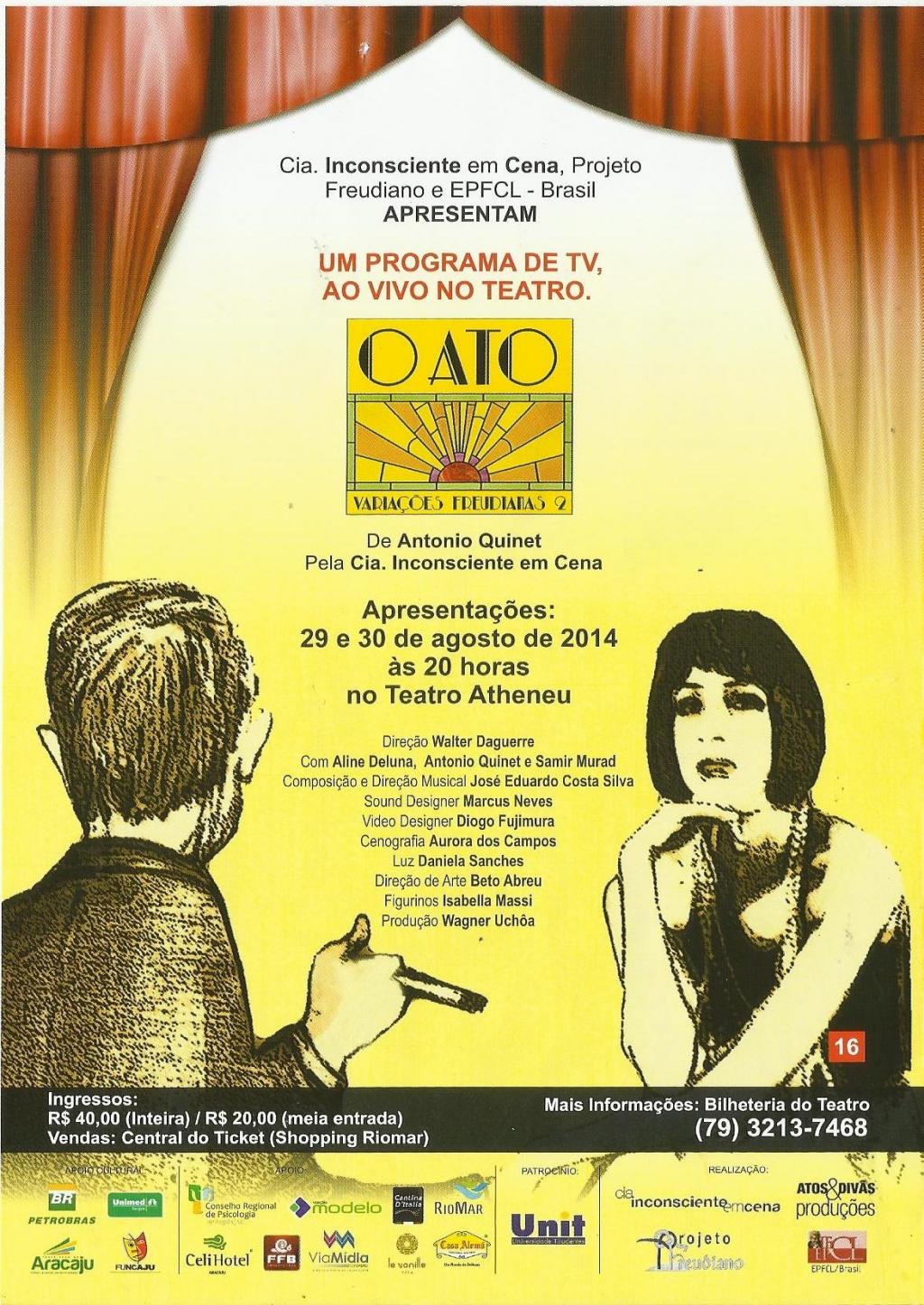 A Cia Inconsciente em Cena, Projeto Freudiano e EPFCL/Brasil apresenta a comédia satírica "O ATO - Variações Freudianas 2". O espetáculo de Antonio Quinet, com direção de Walter Daguerre, será apresentado nos dias 29 e 30 de agosto, no Teatro Atheneu e conta com o apoio da Fundação Cultural Cidade de Aracaju (Funcaju).