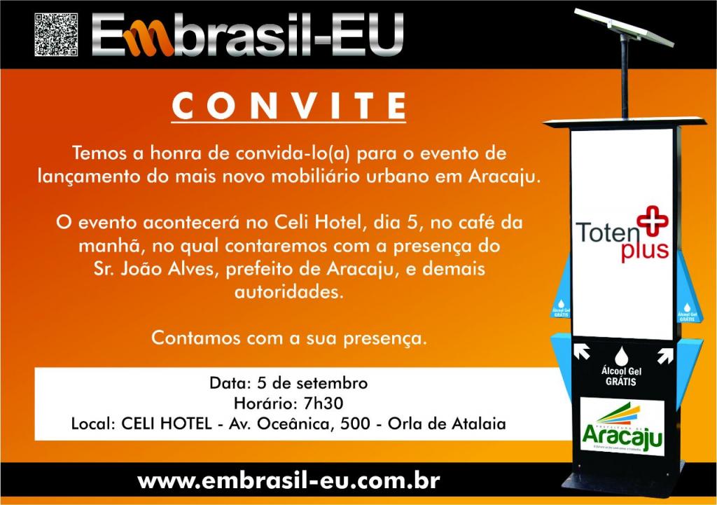 Nesta sexta-feira, 5, às 7h30, o prefeito João Alves Filho convida para a entrega dos tótens da Embrasil em pontos turísticos de Aracaju. A solenidade acontece no Hotel Celi, durante um café da manhã. A ação será realizada pela Secretaria Municipal do Meio Ambiente (Sema). Os tótens fornecem álcool gel e protetor solar.