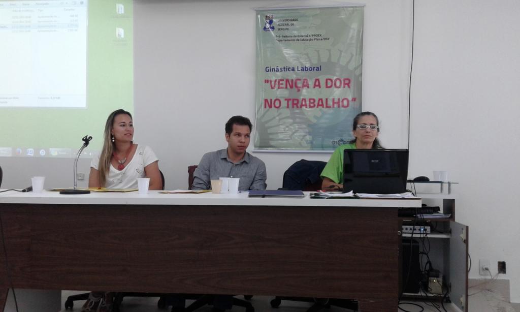 Fazendo parte da mesa de discussão sobre o tema estavam presentes a professora da UFS, Martha Bragança, o fisioterapeuta especialista da área, Jorge Alberto Vieira Filho, a representante da Associação Brasileira de Ginástica Laboral, Ana Paula Silva dos Santos, além dos estudantes dos cursos de Educação Física e Fisioterapia da instituição de ensino.