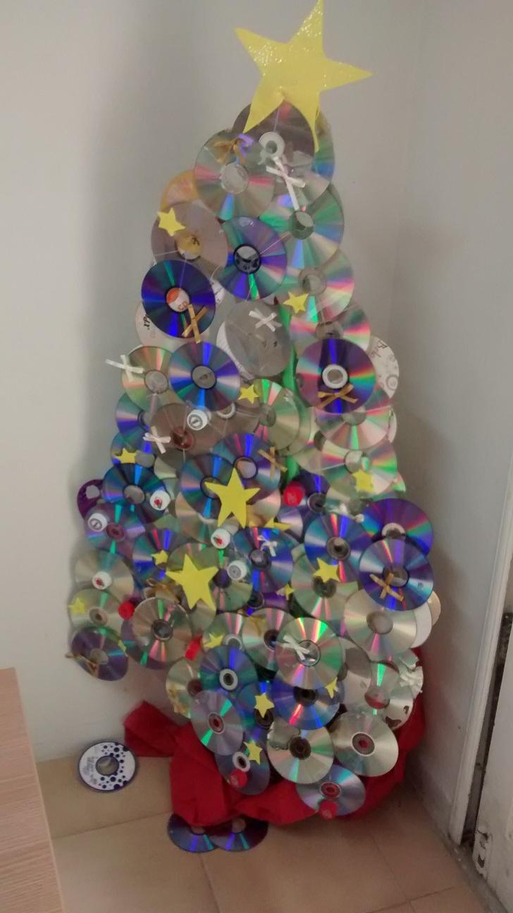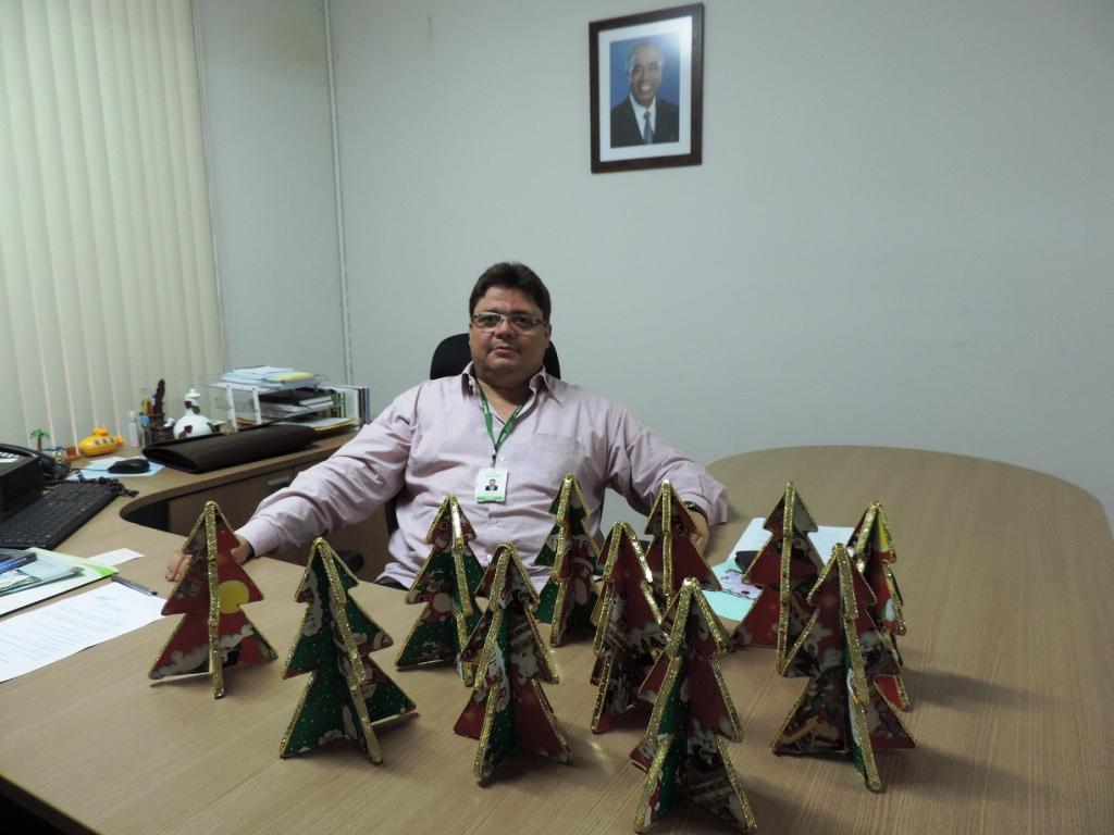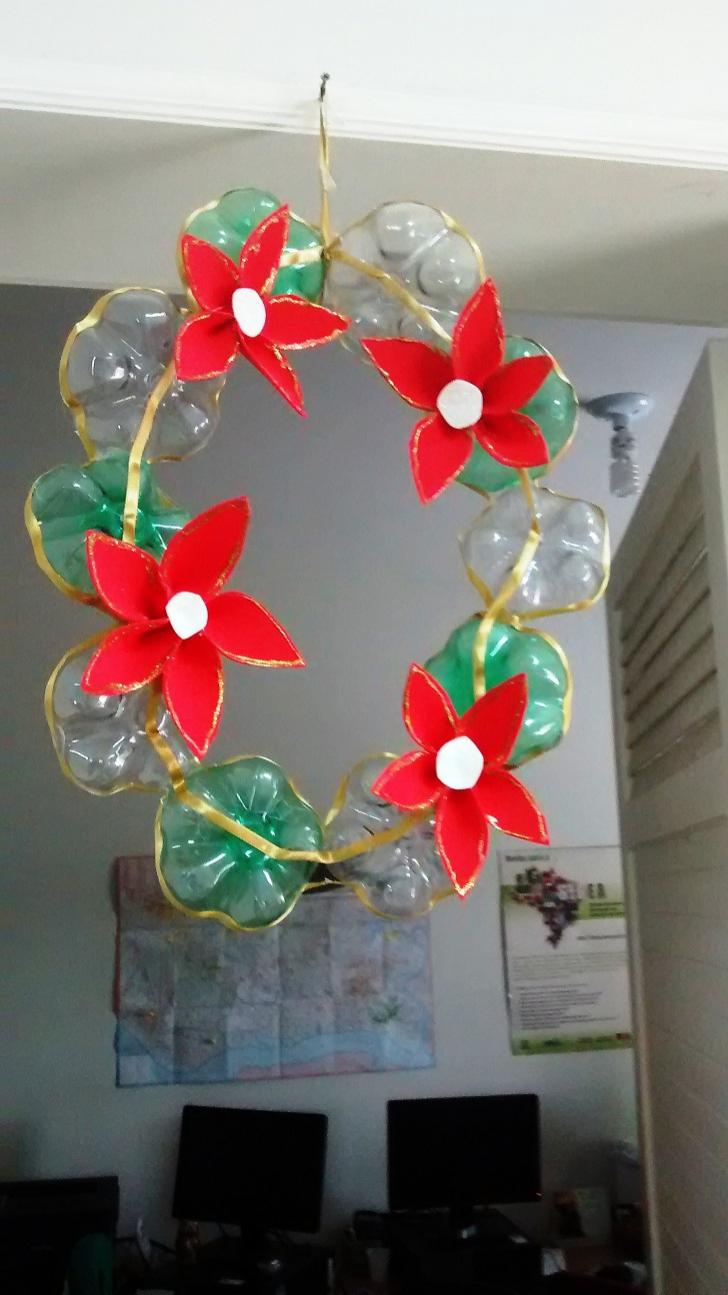 Outro setor que investiu também na reutilização de material reciclável para a decoração natalina foi o de Educação Ambiental, eles produziram a árvore e a guirlanda natalina com CDs, tecidos, tampinhas e garrafas pets.
