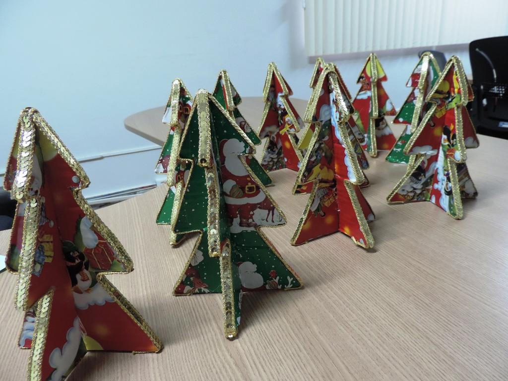A idealizadora da ação foi a coordenadora de Processos da Sema, Carol Boschese. Ela explica o que utilizou para a produção das árvores natalinas de mesa: "O material principal foi o papelão, que reutilizamos dos móveis que chegaram recentemente na Sema. Depois disso, finalizamos os enfeites com papel de presente e uma fita para o acabamento decorativo", diz.