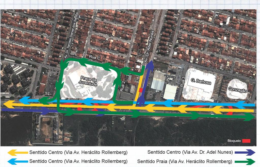 Já para o condutor que estiver na av. Dr. Adel Nunes (Canal 4) e pretende seguir no sentido Praias, deve convergir à direita na Rua C, na esquina do Renatão, até a av. Dr. Tarcísio Daniel dos Santos (Posto de Saúde) e nela, virando à esquerda, chegando ao cruzamento com a av. Heráclito Rollemberg.