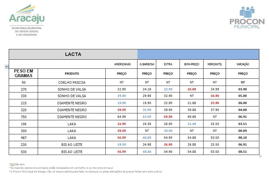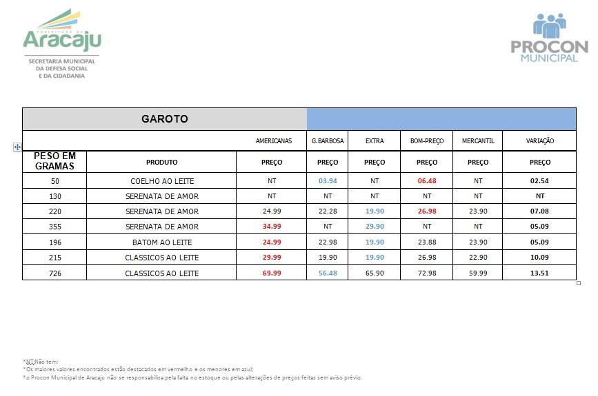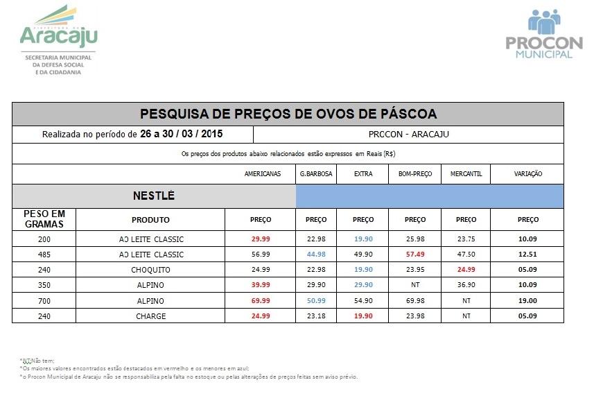 Para orientar o consumidor, o Procon Municipal de Aracaju fez levantamento dos preços de ovos de Páscoa. A coleta, realizada entre os dias 26 e 30 de março, contemplou 24 ovos de três marcas. A maior diferença verificada foi de 37,2% no Alpino, de 700g, da Nestlé.