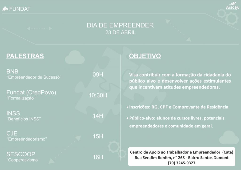 O estímulo à geração de renda ganhará uma atenção especial por parte da Fundação Municipal de Formação para o Trabalho (Fundat). Nesta quinta-feira, 23, no Centro de Apoio ao Trabalhador e Empreendedor (Cate), acontece o "Dia de Empreender". Através de um ciclo de palestras, os aracajuanos poderão obter informações, esclarecer dúvidas e adquirir orientações relacionadas a diferentes temáticas do mundo dos negócios.