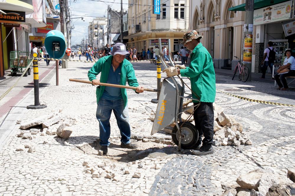 Na manhã desta quarta-feira, 29, o Calçadão da rua Laranjeiras, localizado no Centro Comercial, também foi contemplado com as ações de desobstrução da rede de drenagem e recuperação do pavimento de pedras portuguesas, parte da revitalização atualmente em andamento em toda a região central de Aracaju.