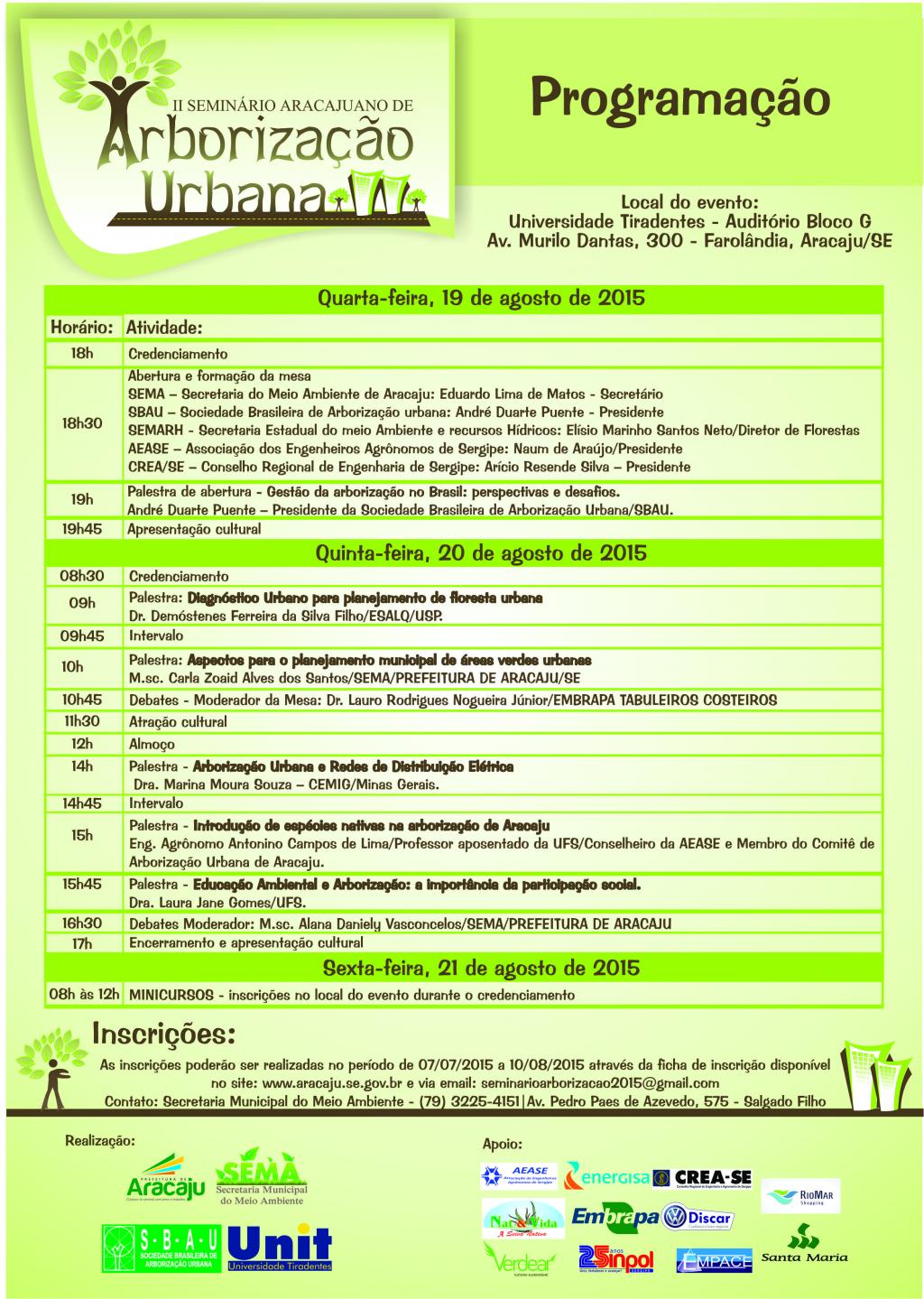As inscrições serão realizadas a partir desta terça-feira, 7, e seguem até o dia 10 de agosto. Os interessados devem acessar a ficha de inscrição disponível no site www.aracaju.se.gov.br ou por email seminarioarborizacao2015@gmail.com.