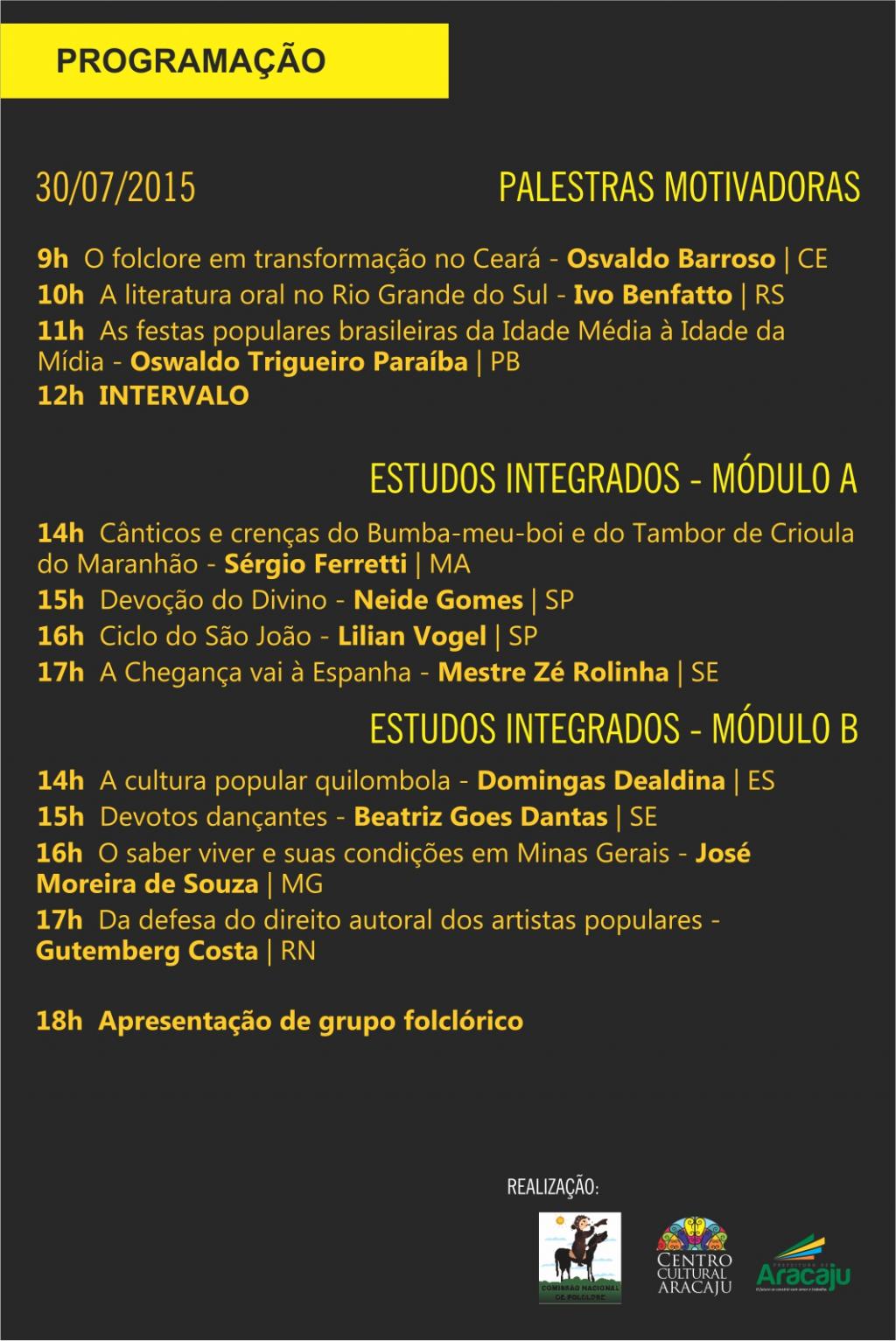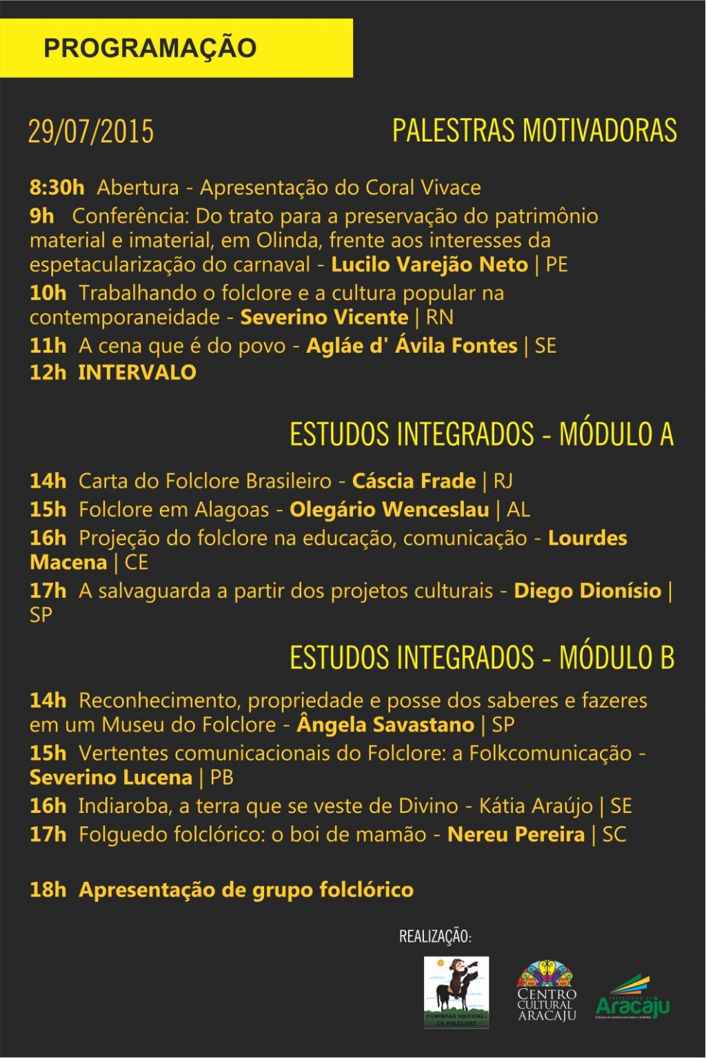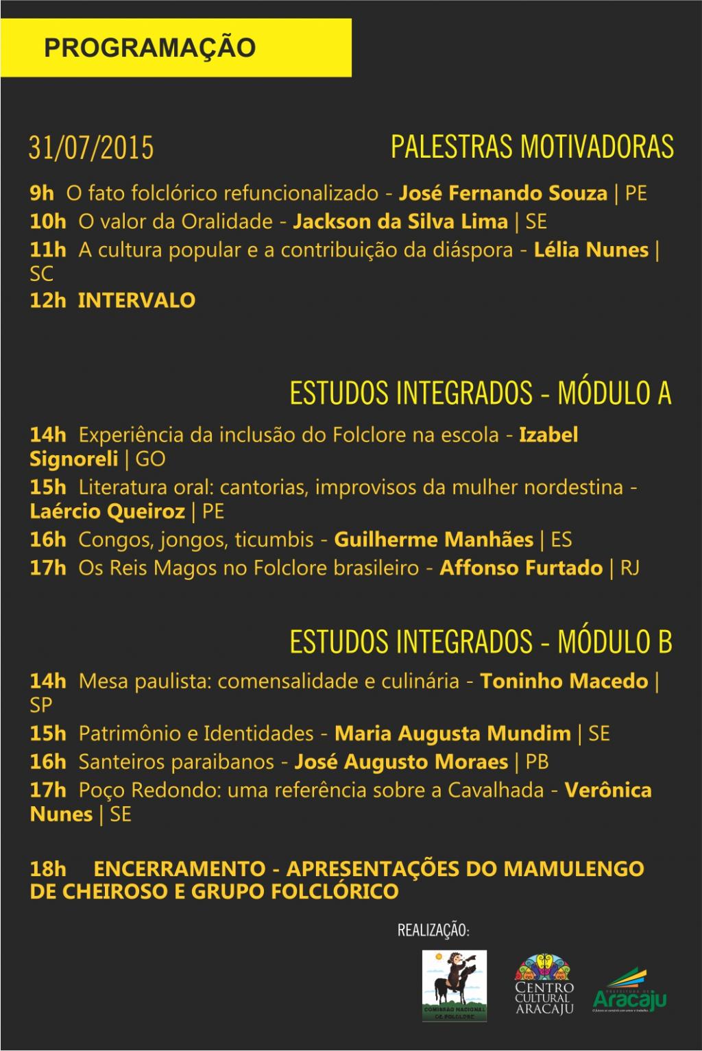 Promovido pela Comissão Nacional de Folclore, em parceria com a Prefeitura Municipal de Aracaju, através da Fundação Cultural Cidade de Aracaju (Funcaju), o evento será realizado entre os dias 29 e 31 de julho, nos turnos manhã e tarde, no Centro Cultural de Aracaju, unidade da Funcaju e terá entrada gratuita.