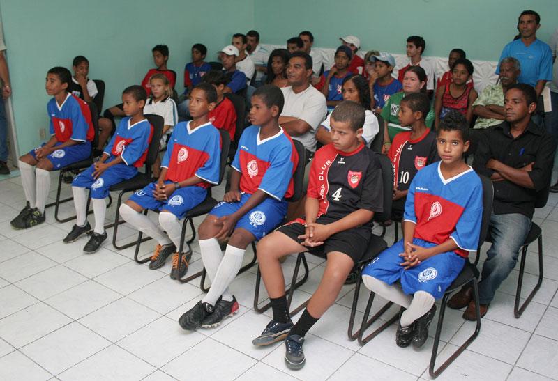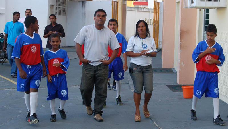 Os pequenos jogadores que participarão do Campeonato Sergipano de Futebol Sub-13 receberam os uniformes na tarde da última sexta-feira, dia 22, no auditório da Federação Sergipana de Futebol, localizado no Estádio Lourival Batista. Este ano, o campeonato conta com o apoio da Prefeitura Municipal de Aracaju, por intermédio da Fundação Municipal de Cultura, Turismo e Esporte (Funcaju), que disponibilizou o fardamento das equipes. Participam da competição 15 equipes profissionais e amadoras. Cada uma recebeu um uniforme completo, nas suas cores predominantes, com camisas, calções e meiões, além de duas bolas de campo oficiais. Durante a entrega do material, o diretor de esportes da Funcaju, Aquiles Silveira, comentou sobre a parceria da Fundação com a Federação Sergipana de Futebol. O Campeonato Sub-13 reúne os times de bairros da capital e de cidades do interior do Estado. As equipes são compostas por crianças de até 13 anos de idade. Os jogos começaram este sábado, dia 23, às 8 horas, no campo do Parque da Sementeira. A previsão é que o campeonato dure aproximadamente 50 dias. Inclusão Social Participar de um campeonato de futebol para os pequenos jogadores dos times de bairros da capital é, muitas vezes, o início do sonho de construção de uma carreira no esporte. Em outros casos, o futebol aparece como alternativa para afastar as crianças e adolescentes da ociosidade. Neste sentido, o esforço dos treinadores e das entidades ou instituições que se dispõem a ajudar é uma peça fundamental para a inclusão social do indivíduo. Cláudio Ramos, técnico do Garra Clube, do bairro Cidade Nova, conta que sua equipe possui 80 integrantes, entre eles crianças e adolescentes, com faixa etária variando de 8 a 17 anos. “Os meninos treinam com muita dificuldade no Parque da Cidade, localizado no Morro do urubu, pois não temos uma estrutura adequada. Participar desse campeonato para eles significa valorização enquanto indivíduo”, relata. O técnico também ressalta que os meninos têm que apresentar bom rendimento escolar para participar dos treinos como forma de incentivo ao estudo. “O esporte e a educação contribuem com a diminuição dos índices de criminalidade e evasão escolar, além de ajudá-los a crescer de forma saudável”, acrescenta. Expectativa dos pequenos Algumas equipes chegaram cedo ao estádio Lourival Batista para receber os uniformes para os jogos do campeonato sub-13. Todos os pequenos jogadores presentes vieram acompanhados dos técnicos responsáveis pela equipe e traziam no rosto a ansiedade para o início da competição. Apesar de tímido, o pequeno Igor Jonatan, que há 2 anos joga no time do Garra como lateral, logo revela sua expectativa com o campeonato. “Meu negócio é marcar um gol e levar o prêmio pra casa”, conta. Já os irmãos Felipe Santos, 13 anos, e Carlos Alberto, 10, ambos jogadores do Siqueira, time do bairro Siqueira Campos, não escondiam a ansiedade para a estréia dos jogos, já que vão jogar pela primeira vez. Felipe, goleiro da equipe sabe o peso da sua responsabilidade. “Vou agarrar todas as bolas. Vou ajudar meu time a ganhar”. Seu irmão Carlos, atacante do grupo, também reconhece a importância de sua posição. “Se depender de mim o placar é 2 X 0. Marco os dois gols”, diz entusiasmado.