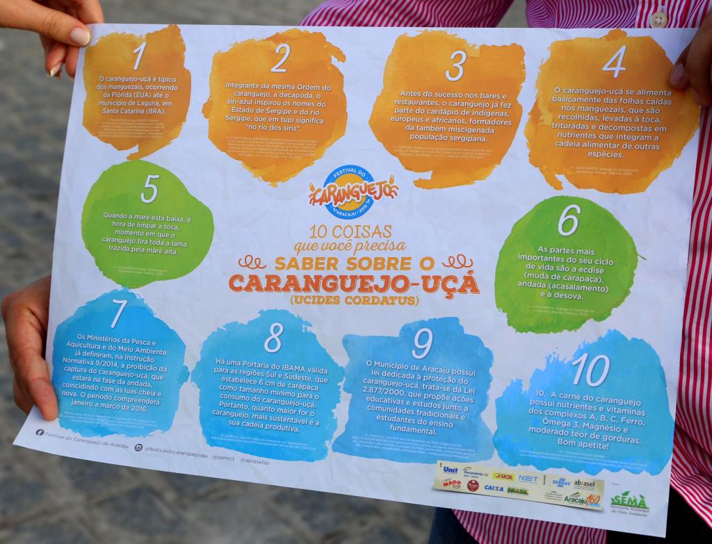 Fábio explica, ainda, que todos os restaurantes que participam do Festival estarão padronizados. "Os bares e restaurantes terão umas placas bem elaboradas, os garçons com os aventais, os displays de mesa, uma série de coisas que a gente produziu. Todos os pratos servidos no Festival terão um jogo americano com informações sobre o Caranguejo Uçá (sobre o tipo de vitamina que ele tem), pois a gente está indo além de um festival gastronômico: vamos buscar levar para população informação sobre o crustáceo que é a cara da cidade", comenta.