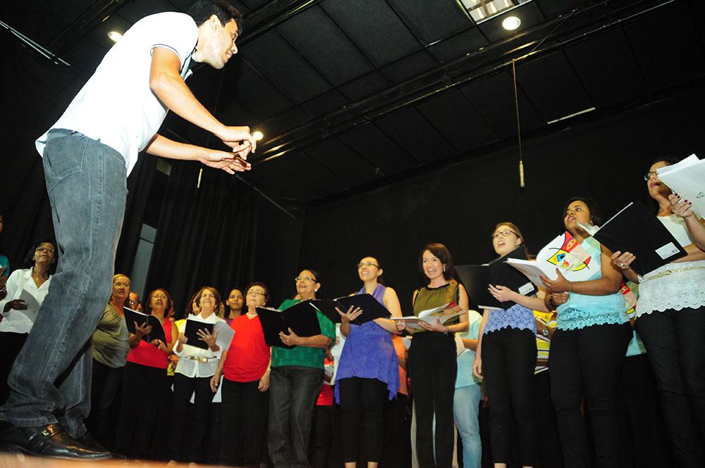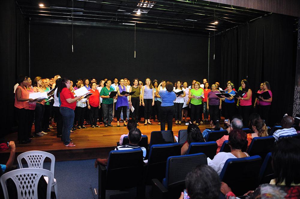 Teatro João Costa completamente lotado. Foi com a plateia cheia que os 130 alunos do curso de regência de coral finalizaram na manhã do último sábado, 29, as aulas que fizeram parte da edição 2015 dos Painéis da Funarte. O encerramento do curso foi marcado por um grande concerto regido pelos próprios alunos, que foram ovacionados pelo público. Músicas como Mana, Canções e Momentos e Despedida de Reisado fizeram parte do repertório, que contou ainda com a apresentação de professores da Escola de Arte Valdice Teles.