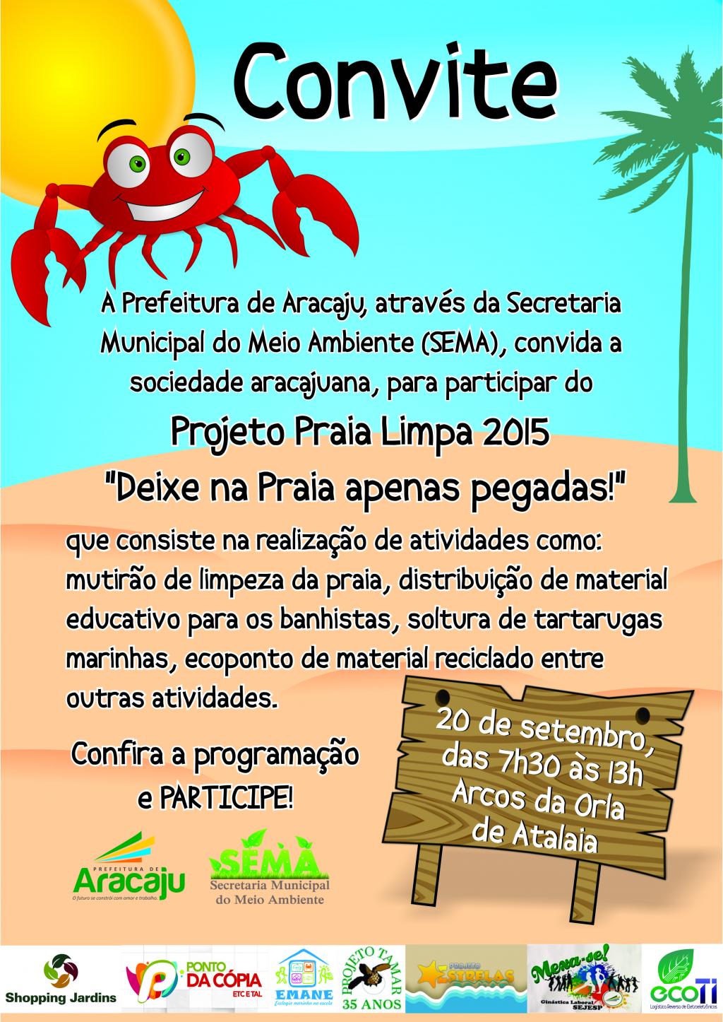 A Secretaria Municipal do Meio Ambiente (Sema) realizará no domingo, 20 de setembro, das 7h30 às 13h, na Praia de Atalaia, o Projeto Praia Limpa 2015. Durante o mutirão de limpeza será entregue material educativo aos banhistas, realização de soltura de tartarugas marinhas, oficinas, teatro e ação com a equipe do "Projeto Mexa-se" da Sejesp.