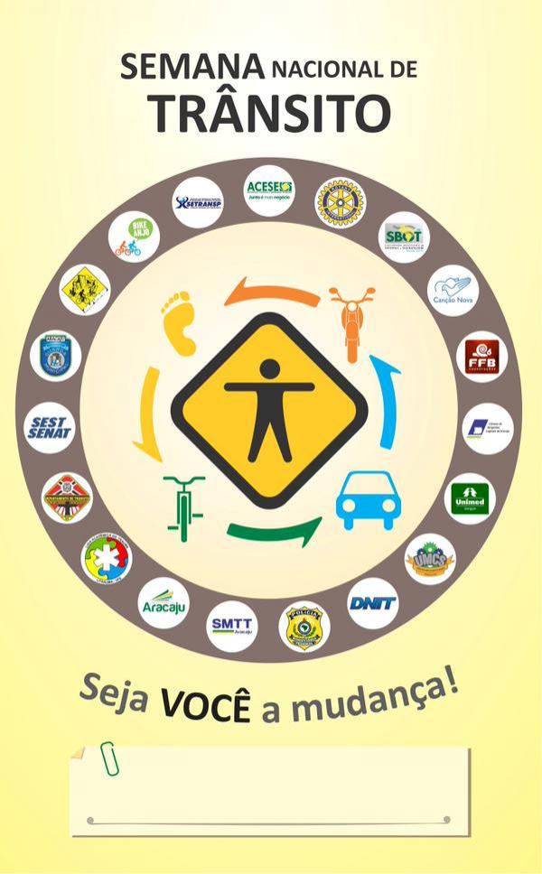 Com uma vasta programação, a Secretaria Municipal da Saúde (SMS) atua na 11ª edição da Semana Nacional do Trânsito, com o tema “Seja você a mudança no trânsito” que, este ano, acontece de 21 a 25 de setembro, em Aracaju, envolvendo diversos órgãos públicos e de representatividade da sociedade civil. O evento é promovido pelo Departamento Estadual de Trânsito (Detran-Se) e Governo do Estado de Sergipe.