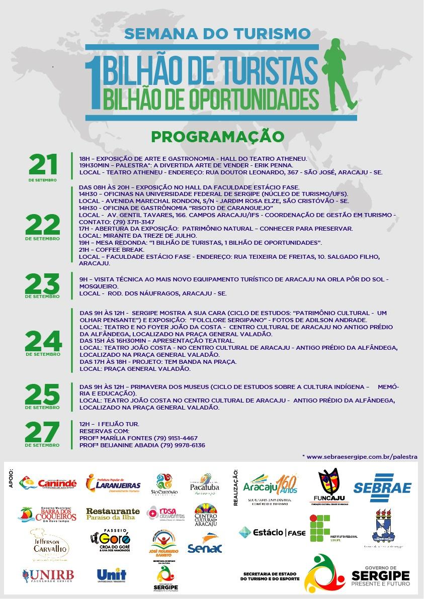 Como forma de contribuir para a capacitação de agentes de turismo e expandir às visitas ao Estado, a Fundação Cultural Cidade de Aracaju (Funcaju) em parceria com a Secretaria de Estado do Turismo, Esporte e Lazer (Setesp) participará da programação da Semana do Turismo. A edição que conta com o apoio de diversos órgãos municipais e empresas privadas será realizada entre os dias 21 e 27 de setembro, sendo os dias 24 e 25 sediados no Centro Cultural de Aracaju (antiga Alfândega) nos turnos manhã e tarde.