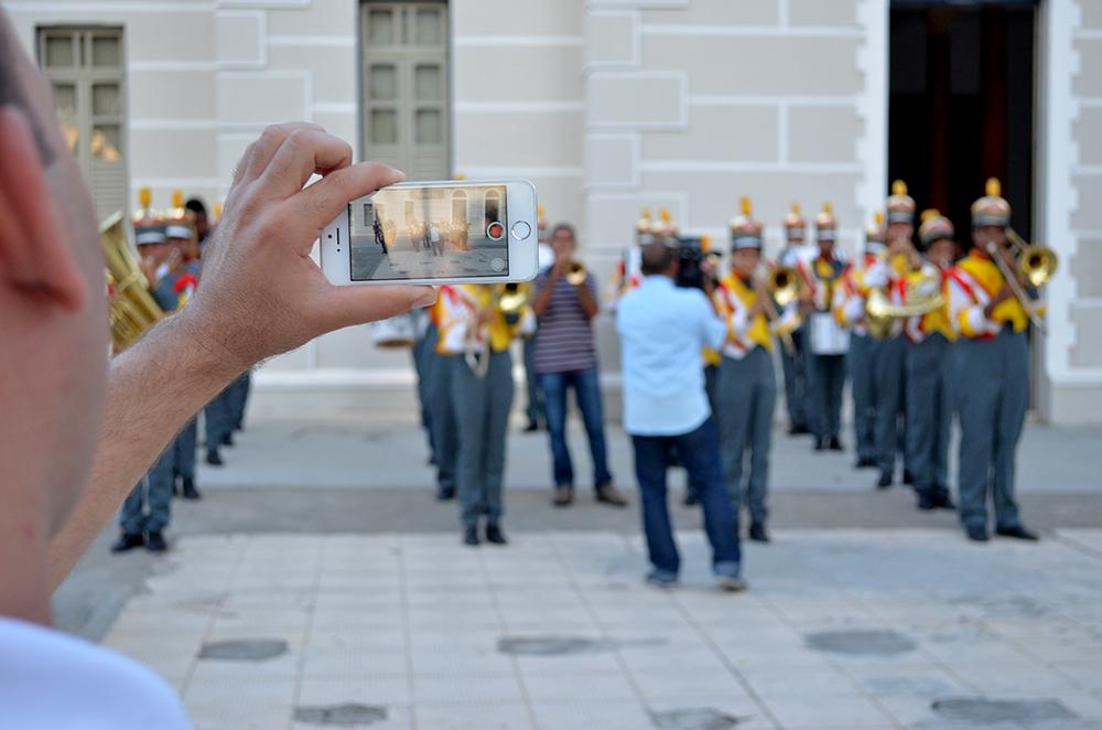 Na tarde de ontem, 24, a Banda Marcial Olga Benário composta por 50 jovens, apresentou ao público um repertório para lá de especial. Entre as canções sucessos de Rihanna, Bruno Mars e clássicos da música popular brasileira chamaram a atenção de quem transitava pelo centro da cidade, como o técnico em segurança do trabalho Bruno Leopoldo, que não resistiu ao som e decidiu dar uma pausa no percurso para apreciar a apresentação.