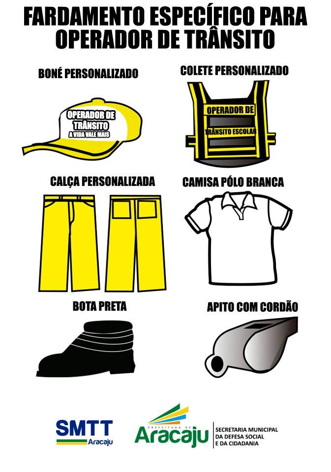Além do treinamento, para atuar como operador de trânsito, a SMTT recomenda um fardamento específico: calça de cor caqui, camisa branca, boné, colete e apito.