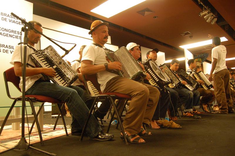 Os músicos que compõem a Orquestra Sanfônica de Aracaju, umas das grandes atrações da 35ª Exposição de Turismo e Congresso Brasileiro de Agências de Viagens - Feira das Américas (Abav) - 2007, que acontece no Rio de Janeiro, farão grande apresentação logo mais, a partir das 19 horas, no auditório principal do Riocentro. A Orquestra Sanfônica de Aracaju já é destaque no cenário musical sergipano, porque valoriza o forró como elemento expressivo da cultura nordestina. O grupo, composto por 25 sanfoneiros, um baixista e três percussionistas, sob a regência e coordenação técnica do músico Emanuel Jorge, fará ecoar os acordes de suas sanfonas tocando clássicos do forró, do chorinho, da bossa nova e do tango argentino para um público de mais de 2.500 pessoas. A estréia da Orquestra Sanfônica no Forró Caju 2007, no último mês de junho, teve um público também grandioso. O que está deixando os sanfoneiros bastante empolgados é o fato de tocar para pessoas de todos os Estados brasileiros e também de várias nacionalidades que circulam pela imponente Feira das Américas. Todo o grupo está bastante feliz e emocionado com essa primeira turnê fora do Estado. Estamos todos ansiosos, em especial hoje, esperando pela apresentação no auditório do Riocentro, afinal, é um grande público formado por pessoas de todos os cantinhos do mundo. Mas preparamos um lindo show e vai dar tudo certo, diz Emanuel Jorge, que ontem acompanhou o grupo durante um ensaio e passagem de som para que os últimos acordes fossem afinados.