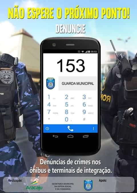 Denúncias de crimes nos espaços públicos municipais, inclusive terminais de integração do transporte público podem ser feitas à Guarda Municipal de Aracaju através do telefone 153 ou através do aplicativo WhatsApp pelo número 98869-4575. O sigilo e o anonimato são garantidos.