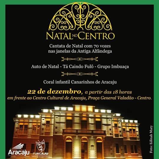Além do Natal no Parque, a Funcaju promoverá também o Natal no Centro, que em seu segundo ano proporcionará ao público uma cantata natalina, onde 70 coralistas posicionados nas janelas da antiga sede da Alfândega interpretará canções natalinas. Confira a programação abaixo: