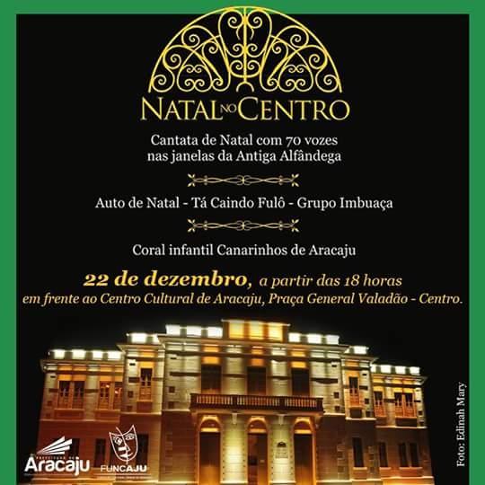 Já no dia 22 de dezembro, próxima terça-feira, a janela da antiga casa da Alfândega em Aracaju será palco para a Cantata Natalina, que faz parte do Natal no Centro. Cerca de 70 coralista, posicionados nas dezenas de janelas encantarão o público cantando músicas natalinas. O Natal no Centro está previsto para começar às 18h e contará também com peça teatral e apresentação dos Canarinhos de Aracaju.