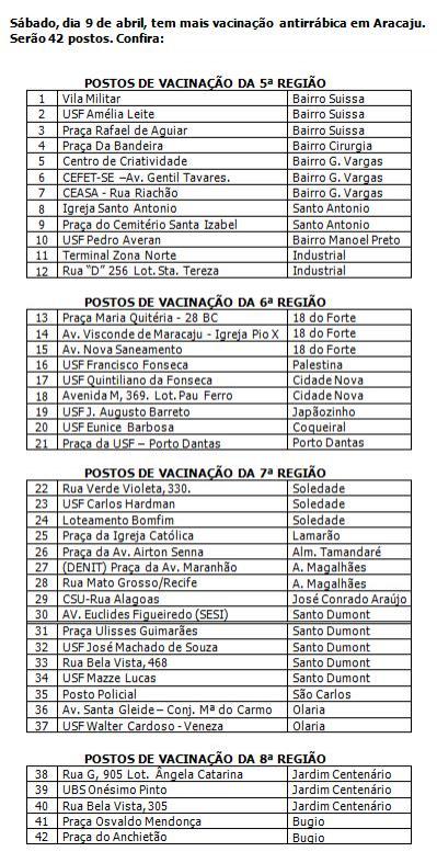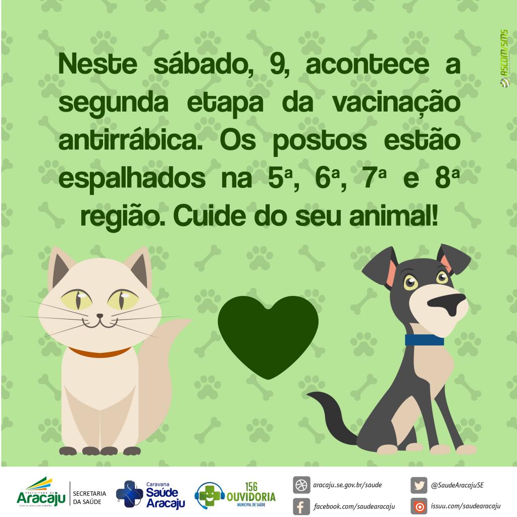 Acontece neste sábado, 9, a segunda etapa da Campanha de Vacinação Antirrábica de 2016, realizada pela Prefeitura Municipal de Aracaju, por meio da Secretaria Municipal da Saúde (SMS). Serão montados 42 postos de vacinação, que irão funcionar das 8h às 17h, espalhados pelas 5ª, 6ª, 7ª e 8ª regiões de saúde, em localidades como Suíssa, Cirurgia, Getúlio Vargas, Santo Antonio, Cidade Nova, 18 do Forte, Santos Dumont, Bugio, entre outras. A meta da SMS é de que 57 mil animais, entre cães e gatos, sejam vacinados até o final da campanha.