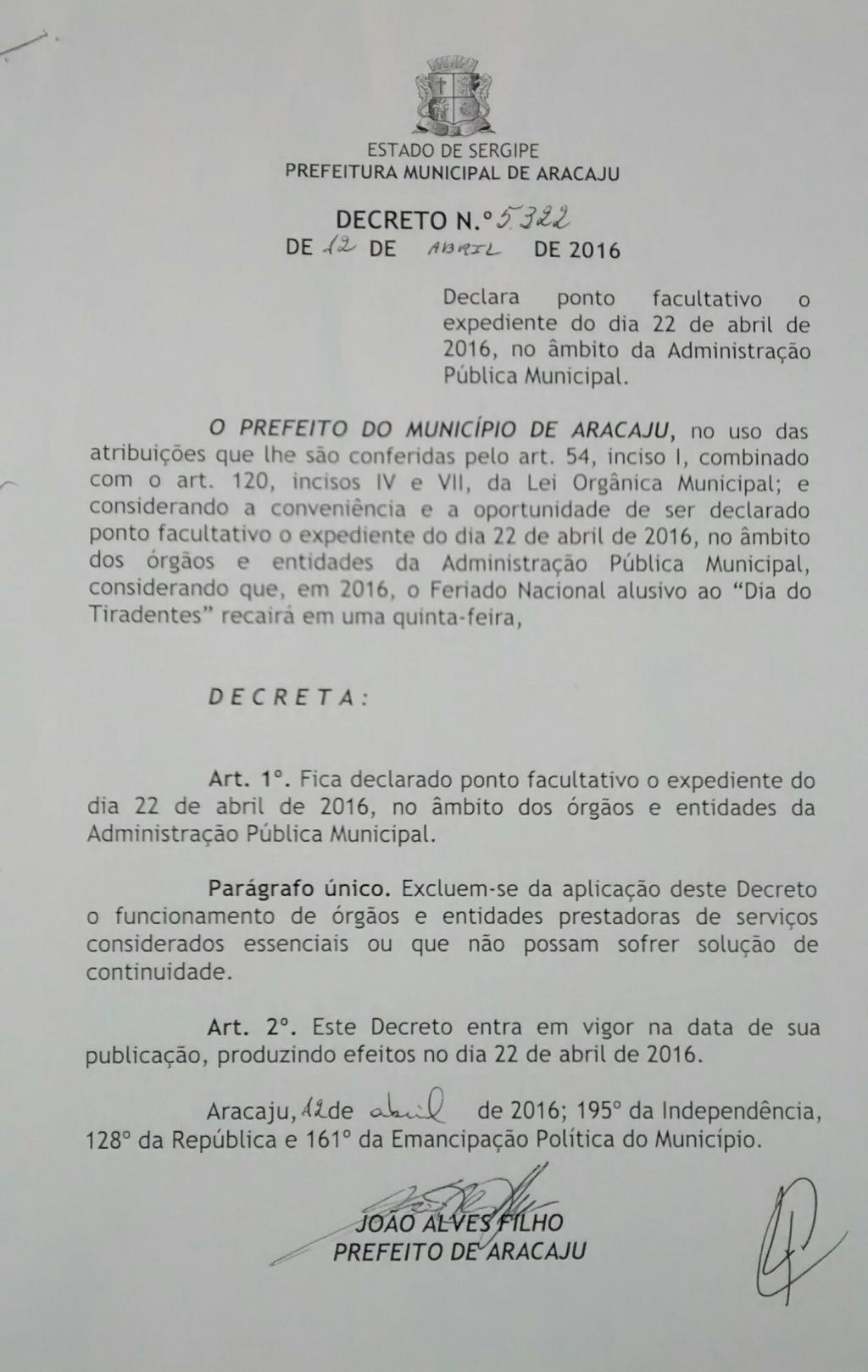Para dar aos servidores da Prefeitura de Aracaju um momento de recesso, o prefeito João Alves Filho assinou o decreto nº 5.322 determinando ponto facultativo no próximo dia 22 de abril. A data sucede o feriado nacional dedicado a Tiradentes (21 de abril).
