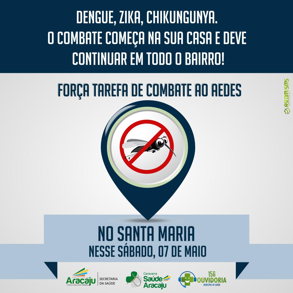 A Prefeitura de Aracaju (PMA), através da Secretaria Municipal de Saúde (SMS), continua realizando mutirões de combate ao Aedes aegypti em diversos bairros da capital sergipana. Neste sábado, 7, a força-tarefa "Todos contra o mosquito" será realizada no bairro Santa Maria e vai contar com a participação dos agentes de endemias e de saúde, que irão visitar as casas da localidade. A concentração acontece na Unidade de Saúde da Família (USF) Osvaldo Leite, que fica na Av. Azul, s/n. O início das atividades está marcado para às 8h.