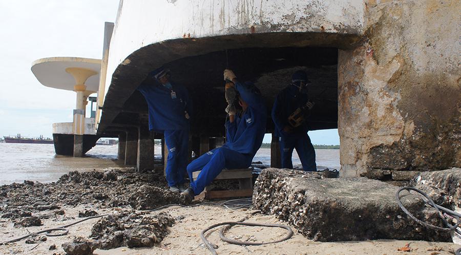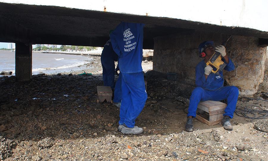 Profissionais da empresa contratada para executar os serviços atuam diariamente para dar celeridade e manter o ritmo dentro do cronograma. Cerca de 20% da obra já foi executada e as ações são desenvolvidas paralelas na estrutura da Ponte. Na parte inferior estão sendo removidos a parte com ferrugem e a "craca", uma espécie de crustáceo marinho semelhante à ostra. A laje também está sendo avaliada e feitos os primeiros retoques, antes da pintura final.
