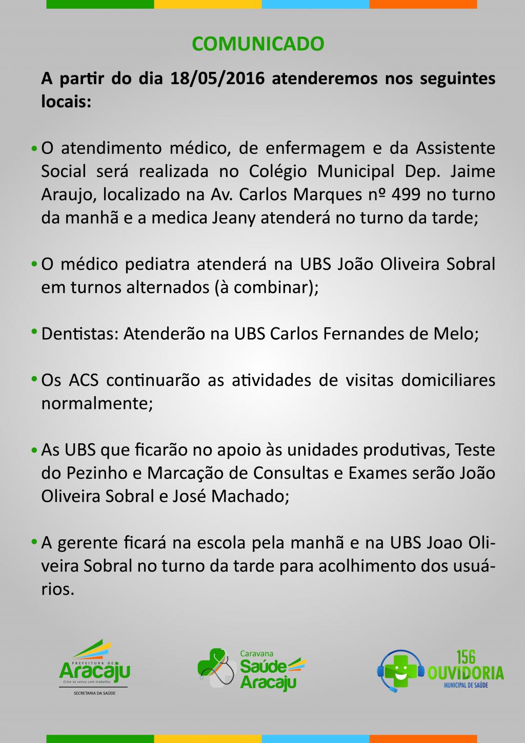 As USFs João Oliveira Sobral e José Machado de Souza também ficarão no apoio às unidades produtivas,  fazendo teste do pezinho e marcação de consultas e exames. É importante ressaltar ainda que a gerente ficará na escola pela manhã e na USF João Oliveira Sobral no turno da tarde para acolhimento dos usuários.