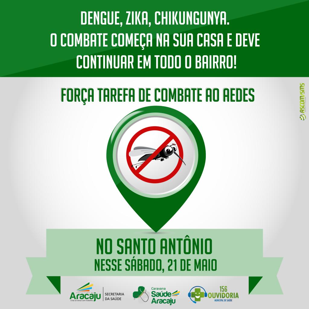 Acontece neste sábado, no bairro Santo Antônio, mais uma força tarefa de combate ao Aedes aegypti. Trata-se de um trabalho contínuo da Prefeitura de Aracaju, através da Secretaria Municipal da Saúde (SMS), com o objetivo de eliminar focos do mosquito transmissor da Dengue, Zika e Chikungunya. Cerca de 100 pessoas, entre agentes de endemias e de saúde, vão percorrer as ruas da localidade para visitar casas, terrenos e estabelecimentos comerciais. A concentração será a partir das 7h e o início das atividades às 8h, saindo da Unidade de Saúde da Família (USF) Cândida Alves, localizada na rua São João.
