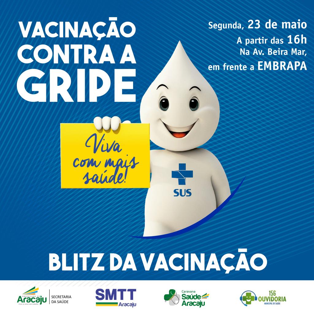 A Prefeitura de Aracaju, através de uma parceria entre a Secretaria Municipal de Saúde (SMS), Superintendência Municipal de Transporte e Trânsito (SMTT) e Embrapa, realiza nesta segunda, 23, mais uma Blitz da Vacinação contra a Gripe. A ação terá início às 16h, na avenida Beira Mar, em frente à Embrapa. Até o momento foram aplicadas 84.329 doses da vacina, número que corresponde a 74,43% do público alvo.