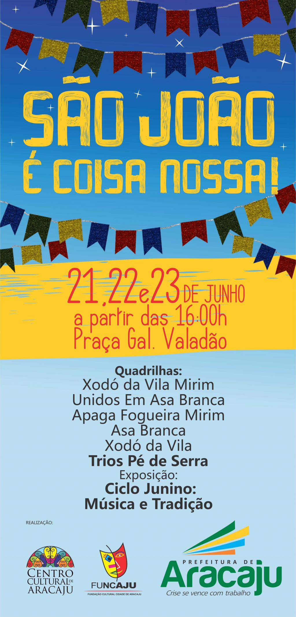 Em comemoração ao ciclo junino, a Prefeitura Municipal de Aracaju, por meio da Fundação Cultural Cidade de Aracaju (Funcaju), preparou uma programação especial para todos os aracajuanos. A fim de resgatar as nossas tradições, será realizado, entre os dias 21 e 23 de junho, o “São João é Coisa Nossa”. Trios Pé de serra, Quadrilhas Juninas e diversos grupos folclóricos farão a alegria de quem passar pela Praça General Valadão, palco escolhido para a celebração.