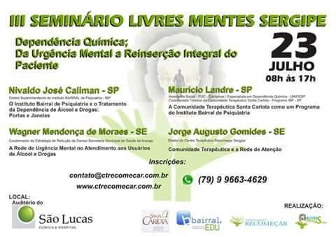A Secretaria Municipal de Saúde (SMS) participou nesse sábado, 23, do III Seminário Livres Mentes Sergipe, que aconteceu no auditório do Hospital São Lucas. Além da Secretaria Municipal de Saúde, o evento contou com a participação do Instituto Bairral de Psiquiatria, da Casa de Repouso São Marcelo, do Recomeçar Centro Terapêutico e da Comunidade Terapêutica Santa Carlota, de São Paulo.