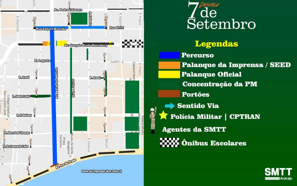 A Superintendência Municipal de Transportes e Trânsito (SMTT) informa o esquema de trânsito montado para o Dia 7 de setembro, quarta-feira, quando será realizado o Desfile Cívico Estudantil da rede estadual de ensino, promovido pelo Governo do Estado de Sergipe. A finalidade é organizar o trânsito no entorno da Avenida Barão de Maruim, onde acontece o evento, garantindo segurança e suporte aos que transitam, fechando ruas e desviando o fluxo de veículos.