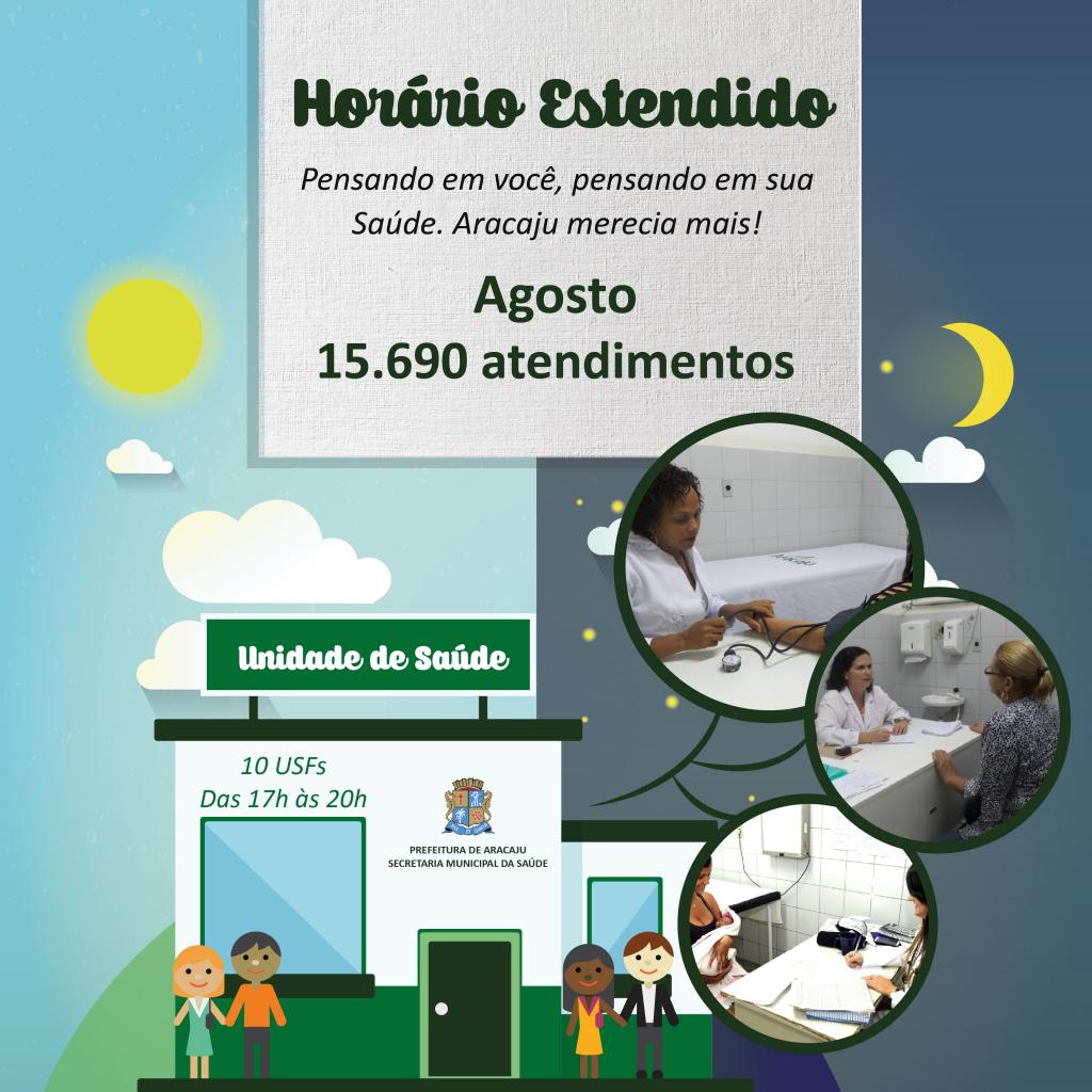 A Secretaria de Saúde de Aracaju (SMS) tem trabalhado incansavelmente para melhorar cada vez mais a qualidade dos serviços de saúde oferecidos à população. Dentro dessa proposta, uma das medidas foi a implantação do horário estendido (das 17h às 20h), nas Unidades de Saúde da Família (USFs). Somente no mês de agosto foram realizados 15.690 atendimentos nas 10 unidades que atualmente oferecem o serviço.