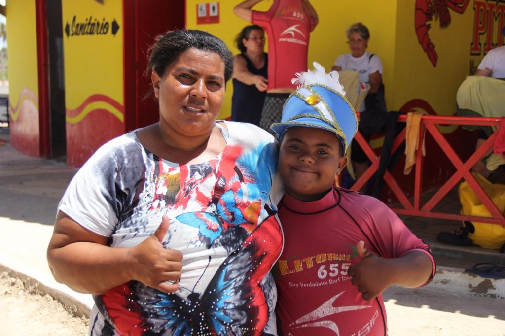 Participante do projeto desde 2011, Geane dos Santos saiu cedo de casa para levar o filho Isaías, 9 anos, que tem síndrome de Down, para praticar bodyboard. Moradora do bairro Santos Dumont, ela acorda às cinco horas da manhã, pega quatro conduções e demora cerca de quatro horas para chegar até a praia. Mas não desanima e diz não ter faltado um dia sequer. “Faça chuva ou faça sol, estou todos os sábados aqui. Meu filho tinha medo de entrar no mar, hoje ele não tem mais. O Estrela do Mar é tão importante pro meu filho quanto pra mim. Aqui é minha segunda casa e eu espero que a prefeitura ajude a gente a mantê-lo.”
