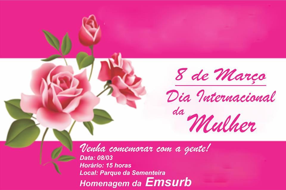 Nesta quarta-feira, 8 de março, a Empresa Municipal Serviços Urbanos (Emsurb), promove uma série de ações em alusão ao Dia Internacional da Mulher. A comemoração acontecerá às 15h, no Parque Augusto Franco (Sementeira). O evento tem como objetivo não só celebrar o dia, mas refletir a história da data e o papel da mulher na sociedade.