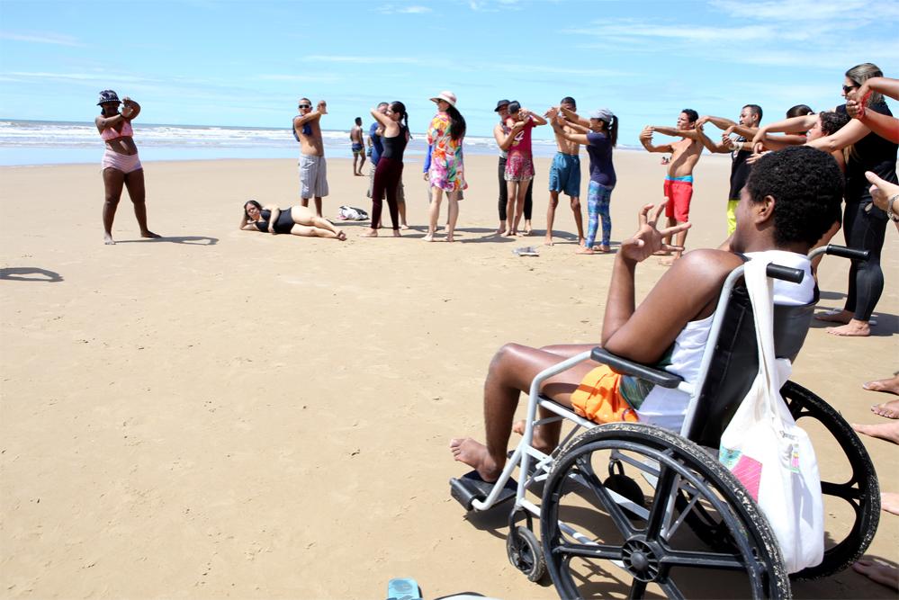 O dia prometia chuva, os pingos ameaçavam engrossar. Mas foi só a van do Centro-Dia Josevaldo Bezerra de Andrade estacionar na Praia de Aruana que o tempo se abriu para dar início a uma manhã repleta de lazer. Sorrisos a postos, chapéus e bonés na cabeça, muita água. “Protetor Solar? Confere!” Foi assim que nesta sexta-feira, 10, agora ensolarada, cerca de 40 usuários da unidade participaram de brincadeiras socioeducativas ao ar livre, à beira mar.