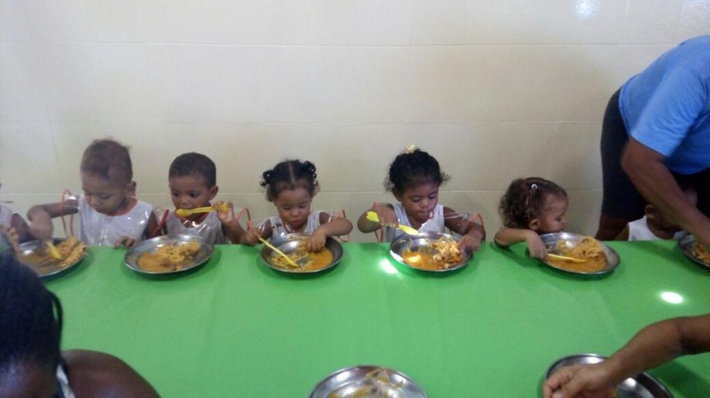 O menu dos estudantes hoje teve arroz, feijão, estrogonofe de frango, legumes cozidos e suco de maracujá. A diretora da Escola Municipal de Ensino Infantil (Emei) Professora Etelvina Amália de Siqueira, Núbia Trindade, garante que o cardápio servido é aprovado pelos estudantes. Todos os alunos da educação infantil da rede recebem quatro refeições diárias. As séries do ensino fundamental recebem uma refeição por turno, todas equilibradas nutricionalmente.