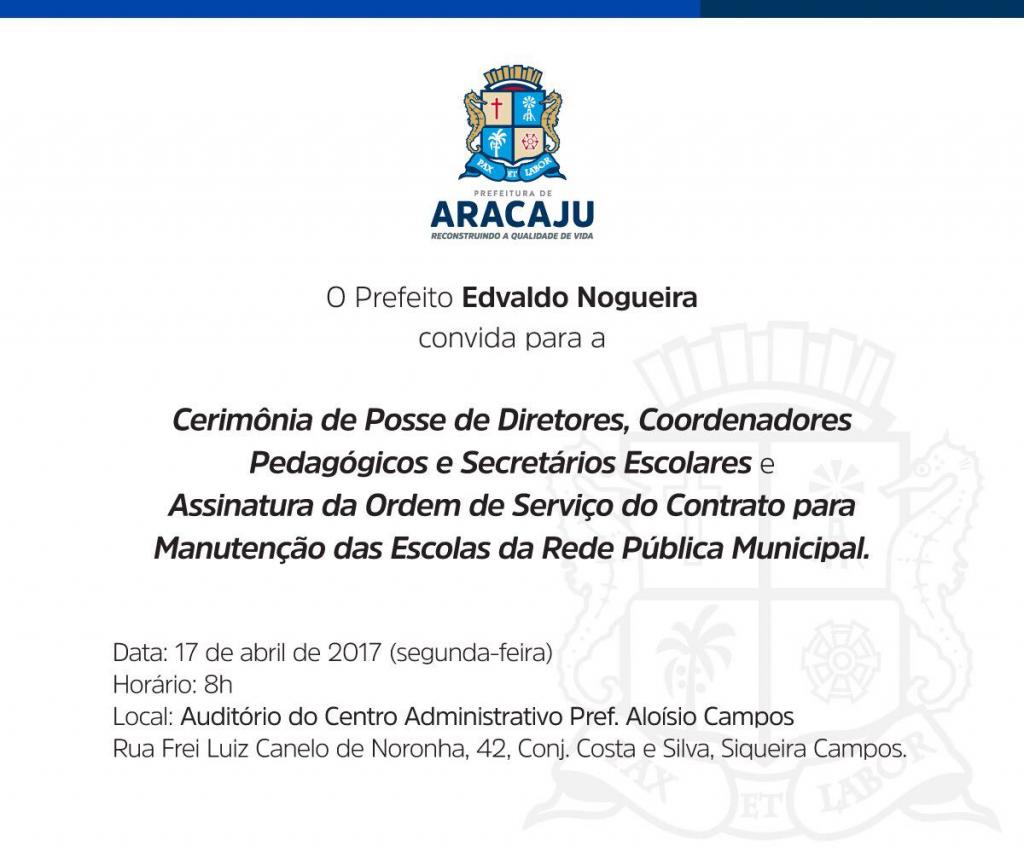 O prefeito de Aracaju, Edvaldo Nogueira, convida toda a comunidade para a posse de 14 servidores municipais que vão compor o quadro em vacância (por aposentadoria ou renúncia para assumir outras funções) na rede municipal da educação de Aracaju. A solenidade acontecerá na próxima segunda-feira, 17, às 8h, no auditório do Centro Administrativo Prefeito Aloísio Campos.