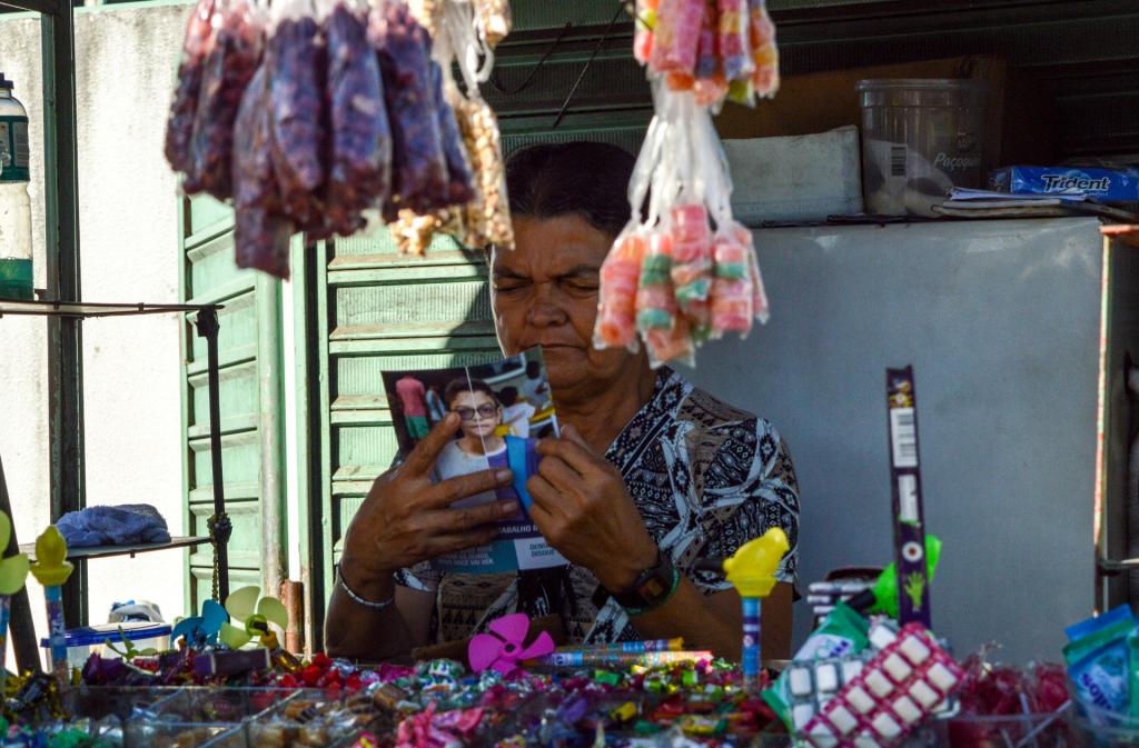 Maria Lúcia é vendedora de doces em uma pequena banca localizada dentro do terminal Maracaju. Aos 59 anos, ela conta que antes dos dez anos de vida já trabalhava em atividades no campo, no interior de Sergipe. Atualmente, ela busca seu sustento como autônoma e luta para que seus filhos, ainda em idade escolar, não precisem vivenciar o que ela passou.