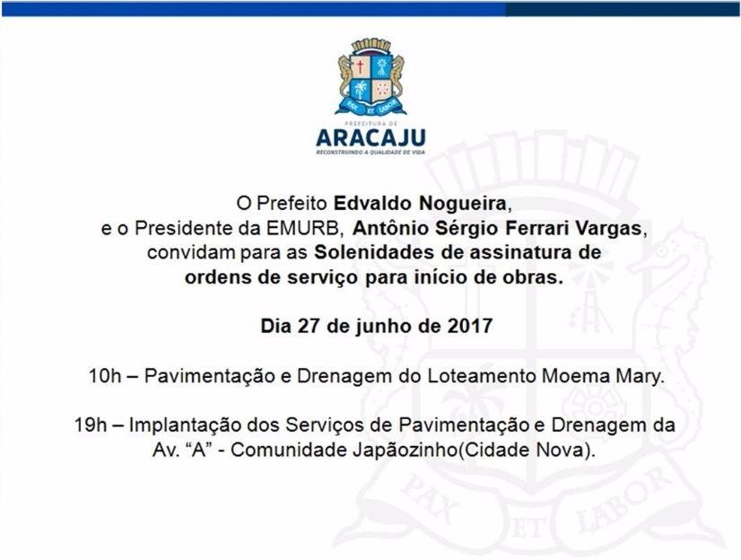 O prefeito Edvaldo Nogueira e o presidente da Empresa Municipal de Obras e Urbanização (Emurb), Sérgio Ferrari, convidam a todos para a assinatura de ordens de serviço para início das obras no loteamento Moema Mary e no bairro Cidade Nova, localizados na zona Norte de Aracaju. As solenidades acontecem nesta terça-feira, 27, às 10h e 19h, nas respectivas comunidades.