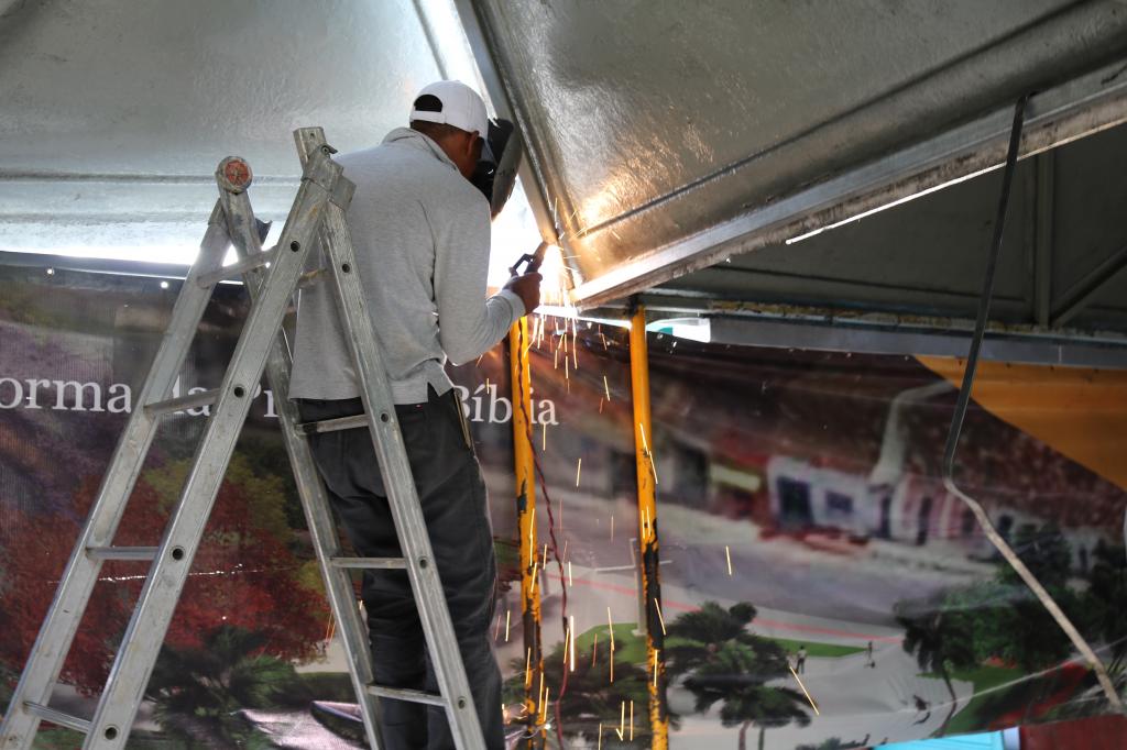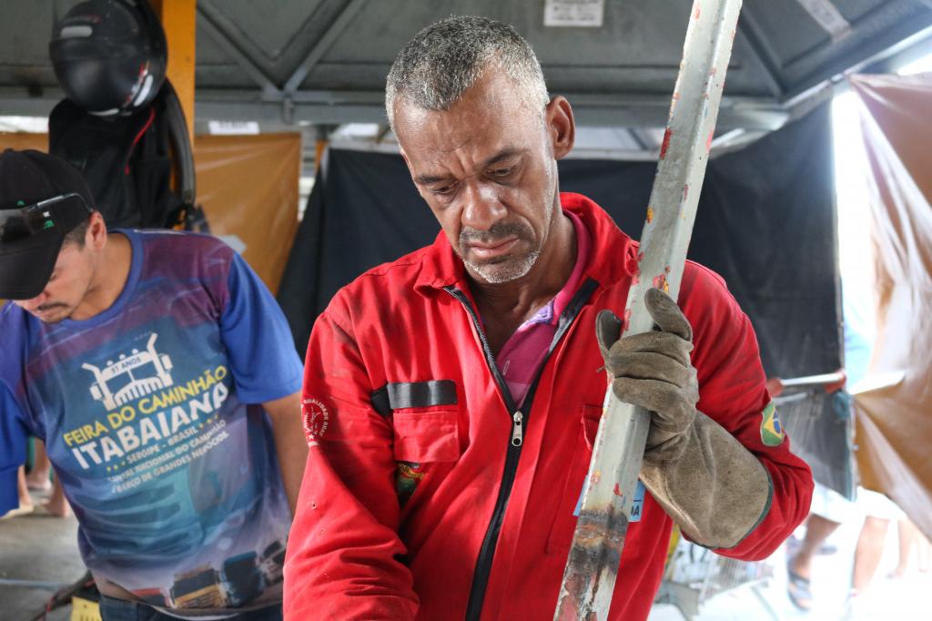 O soldador Edvaldo Batista explica o tipo de reparo feito na estrutura. “Em alguns blocos a estrutura metálica está enferrujada, por isso estamos retirando o pedaço danificado e soldando com metal novo”, disse. Edvaldo também explica que o trecho reparado está isolado para a segurança dos usuários do sistema. “A gente isola uma parte para as pessoas não ficarem passando no meio da obra. Em média, consertamos duas coberturas por dia”, completa.