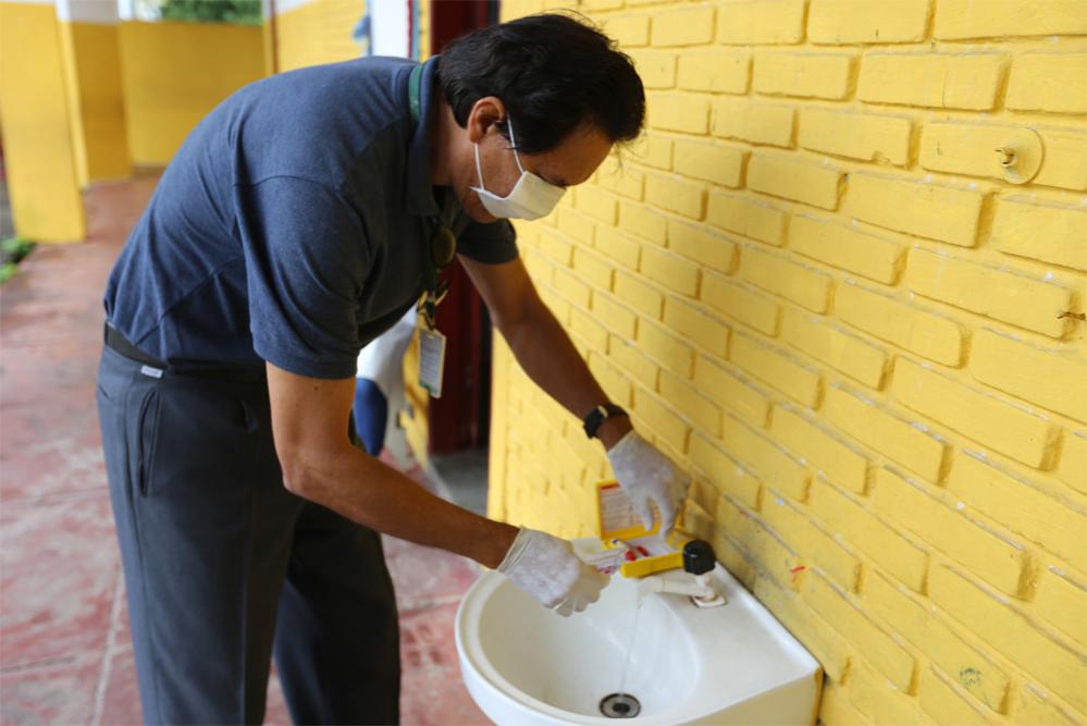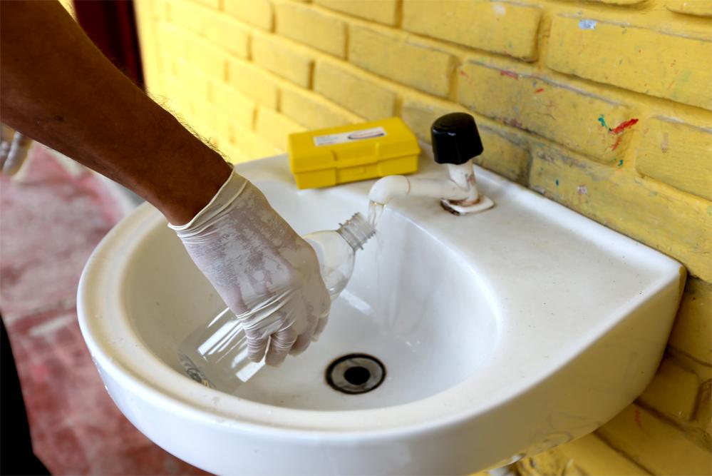 Um dos pontos que recebeu a equipe da Vigilância Sanitária foi a Escola Municipal de Ensino Infantil (Emei) Ana Luiz Mesquita Rocha, localizada no bairro José Conrado de Araújo. Por lá, a equipe recolheu quatro amostras de água: uma para verificar o cloro, outra para o PH, e as demais que foram encaminhadas para o Lacen, onde serão feitas análises mais aprofundadas.