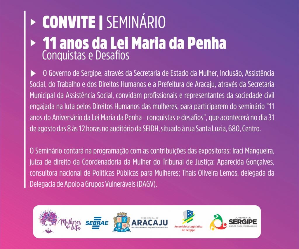 Encerrando as ações em alusão ao aniversário da Lei 11.340, promulgada em 7 de agosto de 2006, que tem como objetivo coibir e punir a violência contra a mulher, a Secretaria Municipal da Assistência Social de Aracaju, em parceria com a Secretaria de Estado da Mulher, Inclusão, Assistência Social, do Trabalho e dos Direitos Humanos (Seidh), realiza no próximo dia 31 de agosto o “Seminário 11 anos da Lei Maria da Penha – Conquistas e Desafios”. O evento é aberto ao público e acontecerá a partir das 9h no auditório da Seidh, localizada na rua Santa Luzia, 680, no Centro de Aracaju.