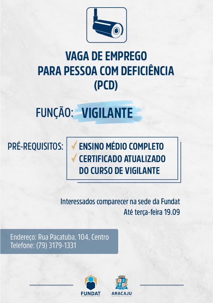 A Fundação Municipal de Formação para o Trabalho (Fundat), através da Agência do Trabalhador, informa que está com oportunidade de emprego para a função de vigilante destinada à pessoa com deficiência (PCD). Para participar do processo de seleção é necessário ter o Ensino Médio Completo e o certificado atualizado do curso de Vigilante.