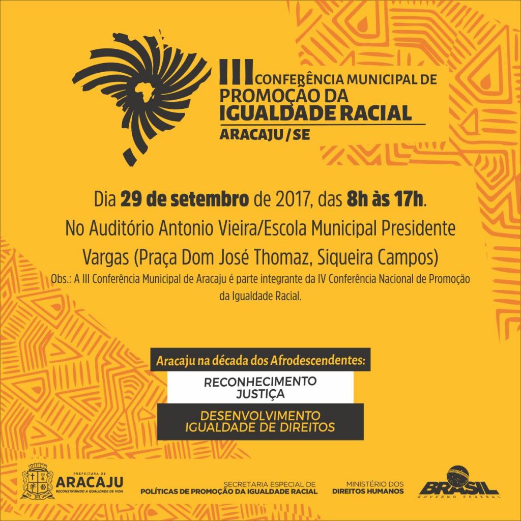 No próximo dia 29 de setembro, ocorrerá a III Conferência Municipal de Igualdade Racial de Aracaju. A partir das 8h, o auditório anexo à Escola Municipal de Ensino Fundamental (Emef) Presidente Vargas receberá palestrantes, mediadores e fomentadores das discussões em torno de temas relacionados ao movimento negro. Realizado pela Prefeitura de Aracaju, por meio da Secretaria Municipal da Assistência Social de Aracaju e em parceria com diversas entidades que atuam em prol da igualdade racial, o encontro terá como tema "Aracaju na década dos afrodescendentes: reconhecimento, justiça e desenvolvimento". A Conferência é aberta ao público em geral, mas para participar é importante assegurar sua vaga realizando previamente sua inscrição. Para se inscrever, basta clicar AQUI.